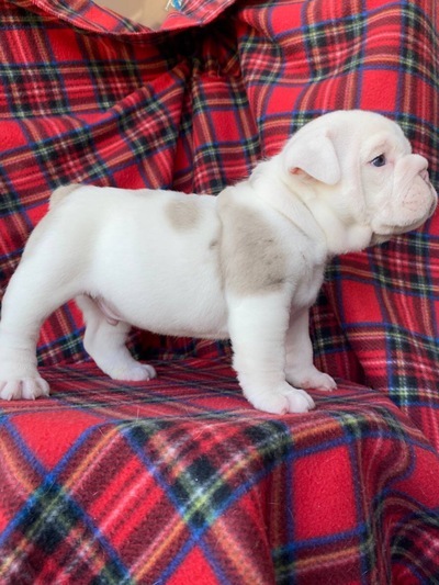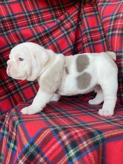 Щенок цветного английского бульдога, мальчик. Окрас голубой мерль с подпалом. Документы АВKC. Привит по возрасту. Озорной, чудесный мальчик ищет своих маму и папу.